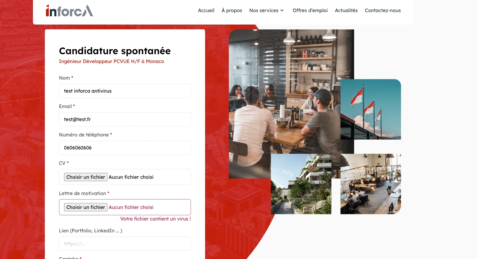Nous avons intégré le script sur le site inforca au niveau des formulaires de candidature. Il nous permet d'analyser en temps réel les fichiers joints (cv, lettre de motivation). Chaque document est scruté par le module pour détecter et bloquer les menaces avant qu'elles n'atteignent nos serveurs.
